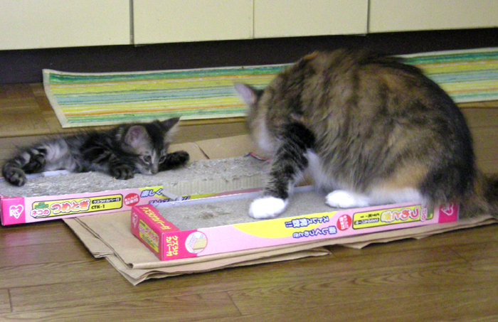 爪研ぎ並べてみたら、一緒に乗っかってた(=´∇`=)